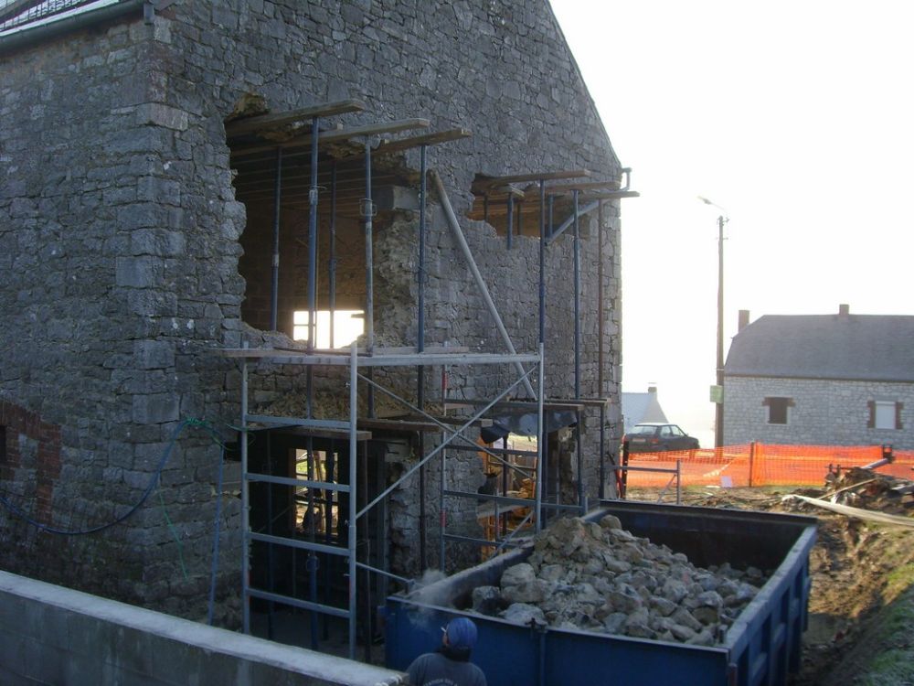 Les cailloux ont été récupérés pour la maçonnerie enterrée et de nouvelles pierres ont été placées pour les anglées ainsi que pour les linteaux. Les linteaux de cailloux ont été posés sur une cornière galvanisée.